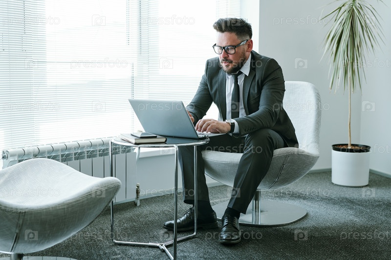 Бородатый бизнесмен в костюме сидит на кресле перед ноутбуком в офисе