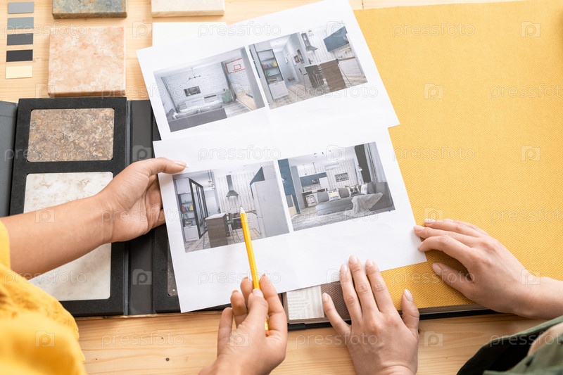 Обзор рук двух молодых женщин-дизайнеров интерьера, обсуждающих фотографии