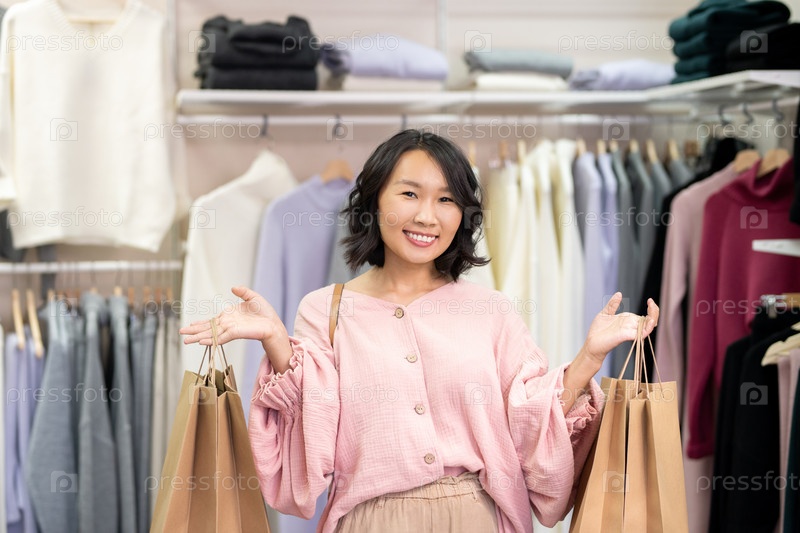 Молодая жизнерадостная женщина-покупательница в умной повседневной одежде, держащая большие бумажные пакеты