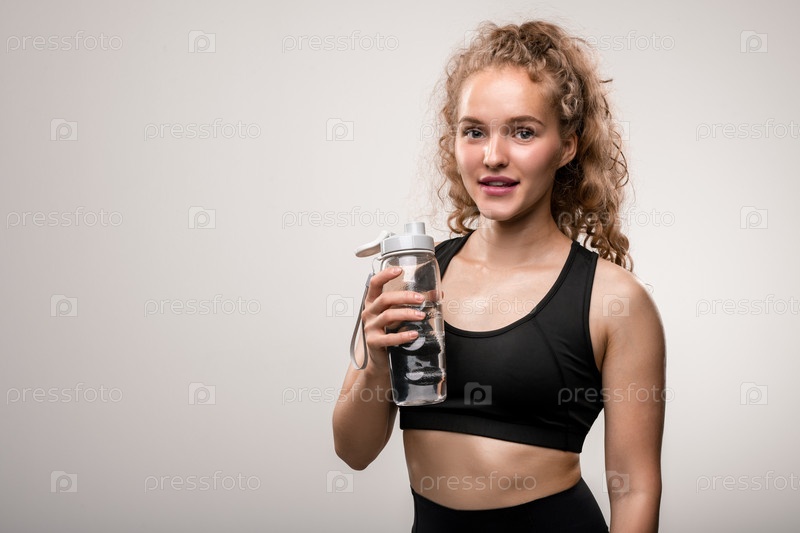 Счастливая молодая спортсменка в черной спортивной одежде собирается выпить воды после тренировки