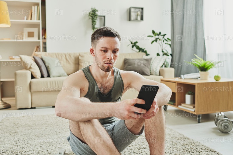 Молодой серьезный спортсмен в спортивной одежде сидит на ковре в гостиной