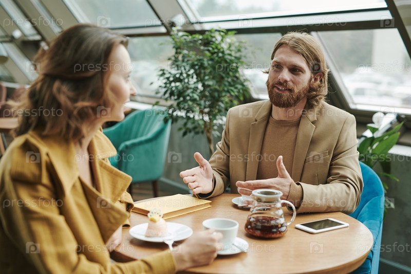 Уверенный молодой человек в обычной рубашке сидит на кресле и отворачивается, разговаривая по телефону в современном кафе
