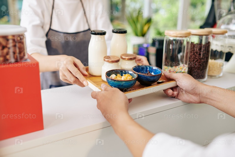 Официант дает клиенту поднос с завтраком
