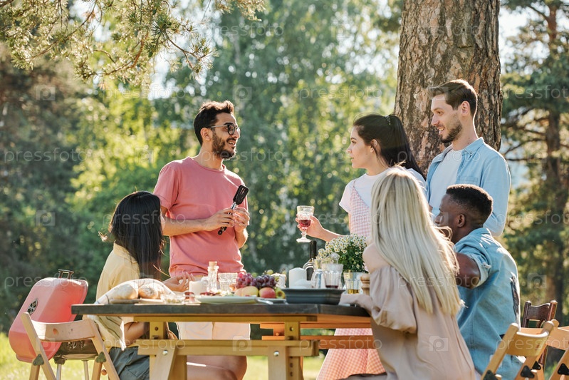 Красивая девушка со стаканом вина стоит рядом со своим парнем и разговаривает с другом