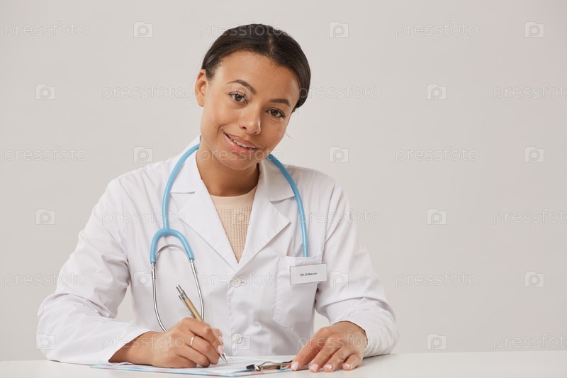 Женщина-врач, позирующая на рабочем месте на белом
