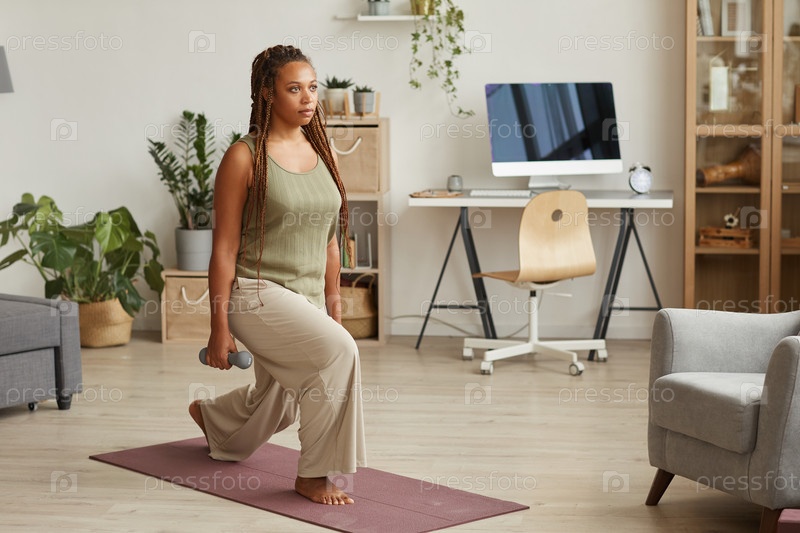 Женщина тренируется с гантеликами в комнате