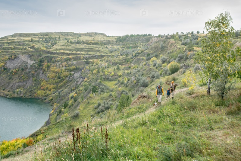 Семья отца. мать, их маленький сын и пушистый питомец движутся по тропинке