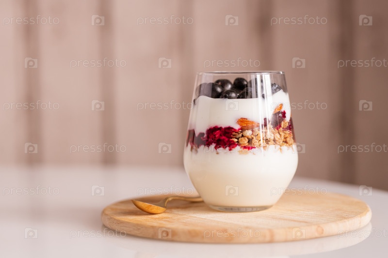 Стекло с несколькими слоями свежих ингредиентов йогурта стоит на деревянной доске