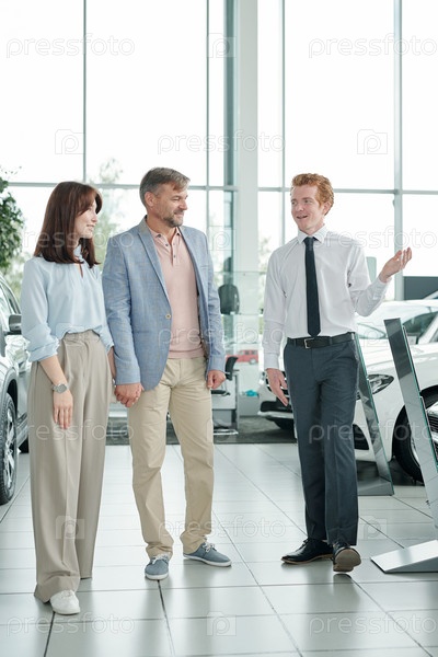 Мужчина-менеджер современного автоцентра, представляющий один из новых автомобилей счастливой паре