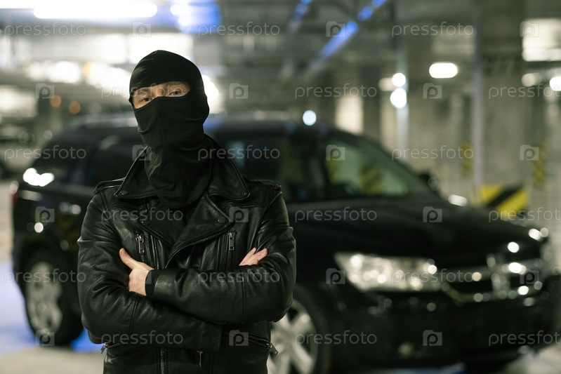 Мужчина-преступник в черной куртке и балаклаве стоял на парковке