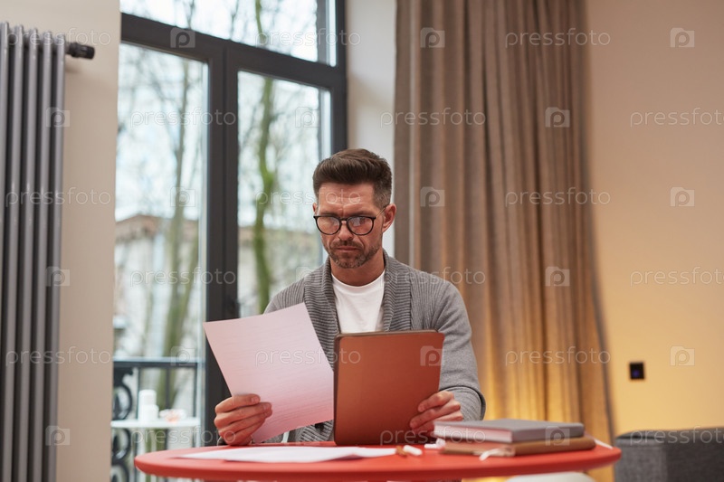 Улыбающийся зрелый бизнесмен, работающий из дома