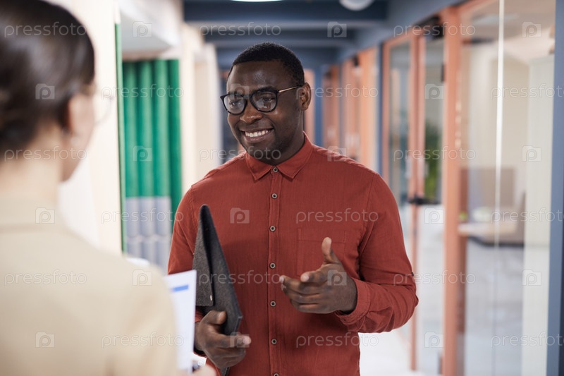 Веселый африканский бизнесмен разговаривает с коллегой в офисе