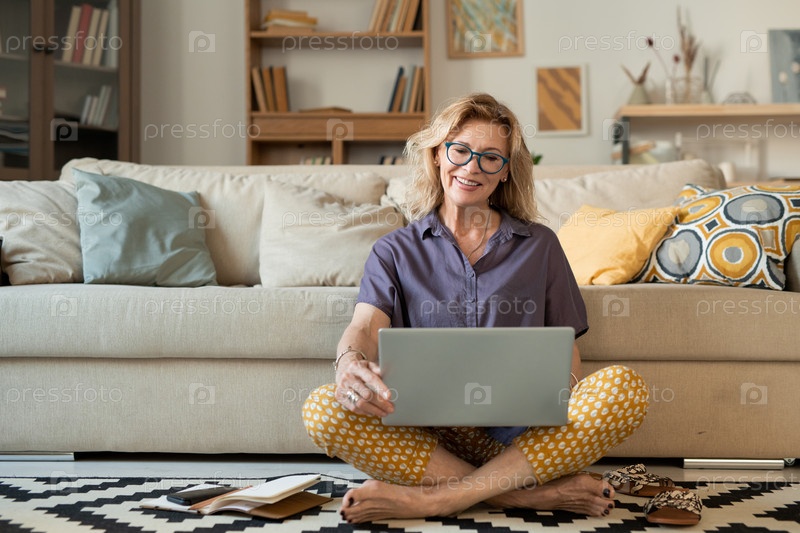 Счастливая зрелая крестоногая женщина держит ноутбук, глядя на его дисплей