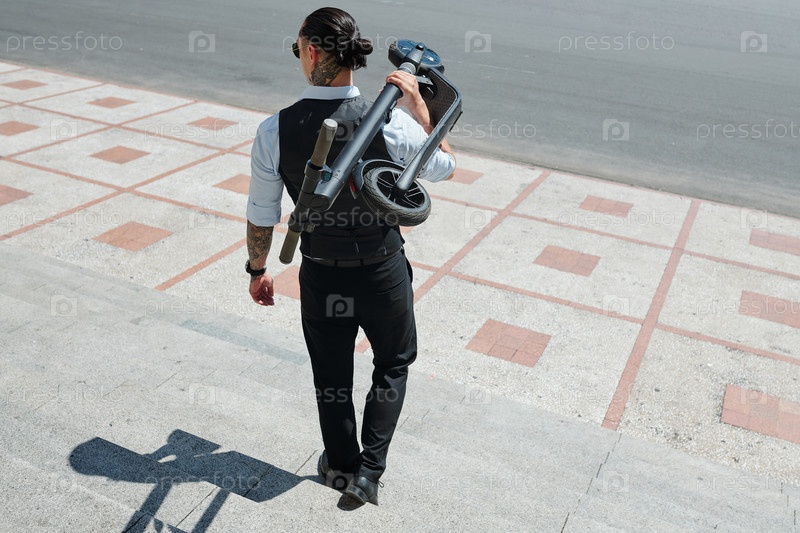 Уверенный в себе мужчина, несущий скутер