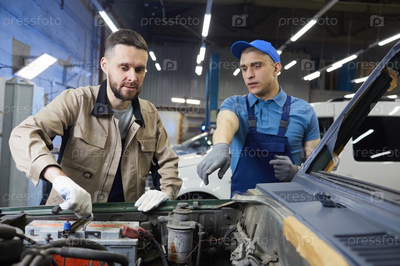 Два мужчины ремонтируют автомобиль