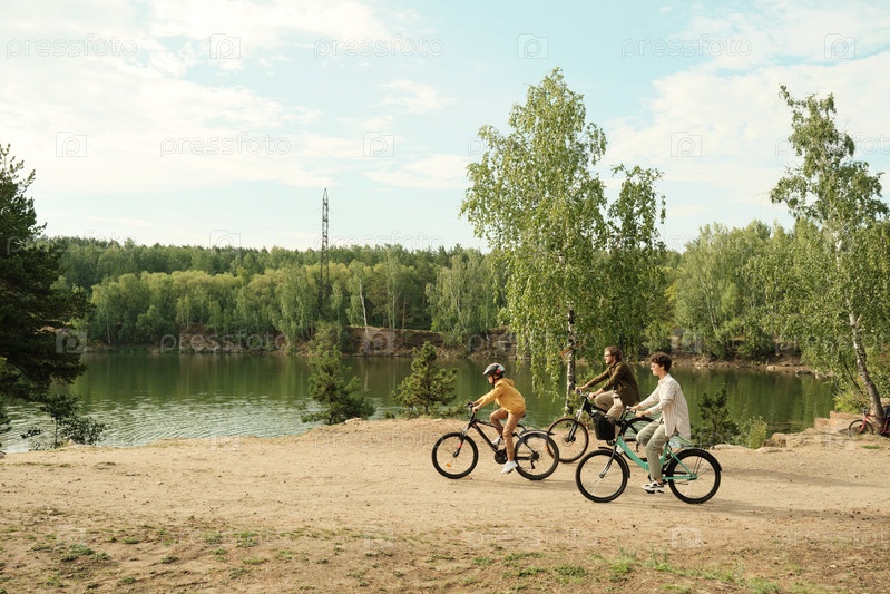 Боковой вид молодой семьи, сидящей на велосипедах и движущейся вдоль берега реки