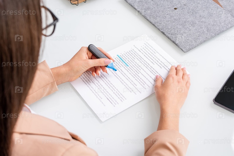 Молодая брюнетка-бизнесменка подчеркивает основные моменты и условия контракта