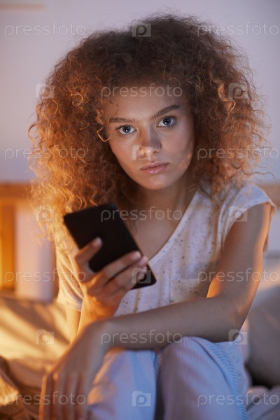 Молодая женщина с кудрявыми волосами, сидящая по ночам на кровати