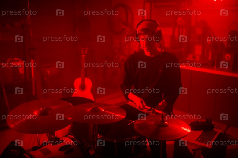 Молодой барабанщик слушает свою музыку в наушниках, записывая новые вещи