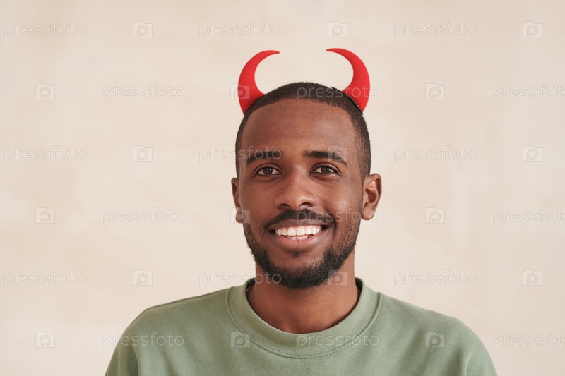 Портрет веселого молодого чёрного бородатого мужчины с красными рогами дьявола, стоящего на бежевом фоне, концепция Хэллоуина