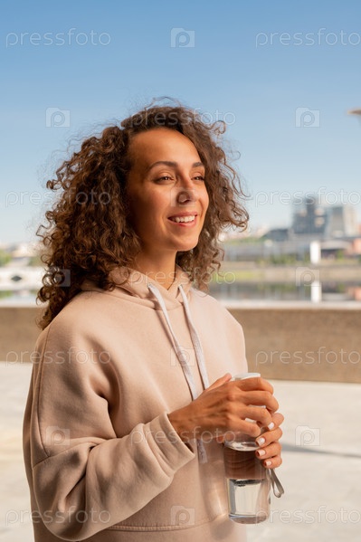 Молодая улыбающаяся спортсменка в активной одежде пьет воду после тренировки на свежем воздухе