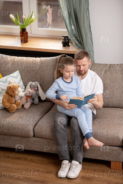 Умная маленькая девочка в пижаме сидит на коленях у отца, читая книгу
