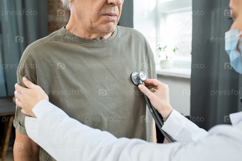 Руки молодой женщины-врача в белом халате, осматривающей дыхание больного пожилого человека