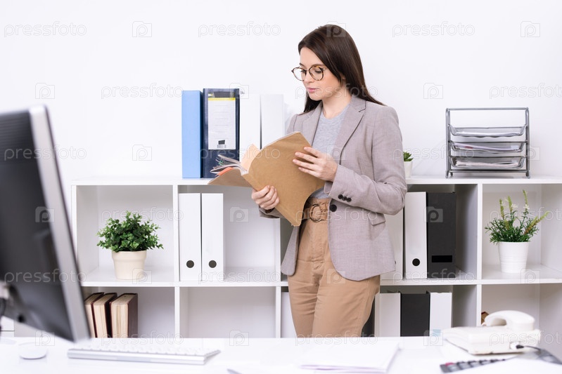 Современная молодая бизнесвумен или бухгалтер, просматривающая бумаги