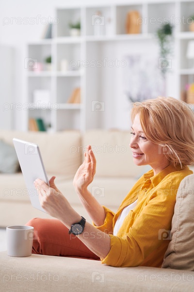 Счастливая спокойная зрелая женщина в повседневной одежде отдыхает на диване с планшетом