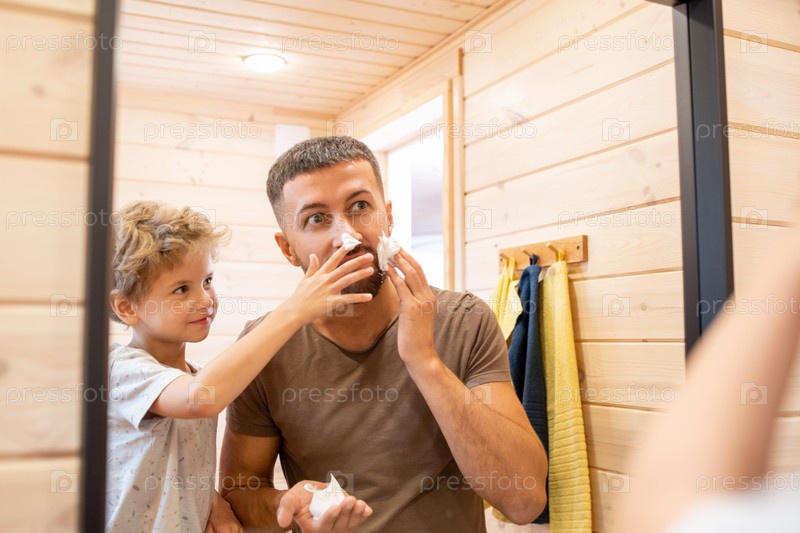 Милый мальчик развлекается со своим отцом, который наносит пену на лицо перед бритьем