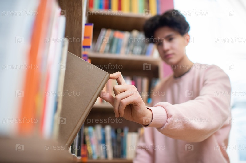 Рука подростка-мужчины в розовой свитерке, берущая книгу на коричневом обложке с полки