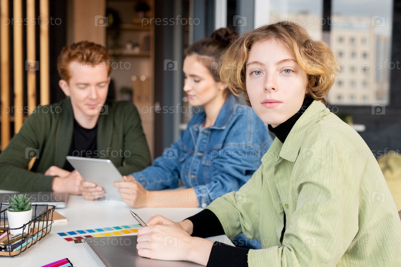 Молодая серьезная женщина-разработчик мобильных приложений смотрит на тебя против коллег