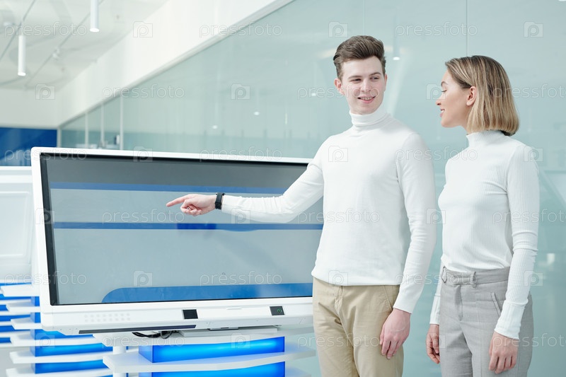 Счастливый умный молодой человек, представляющий новое футуристическое программное обеспечение на выставке