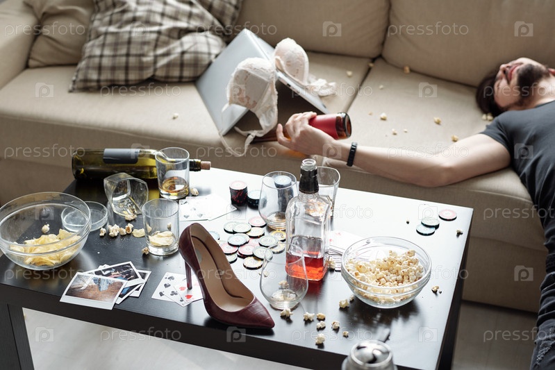 Пьяный мужчина спит в беспорядочной гостиной