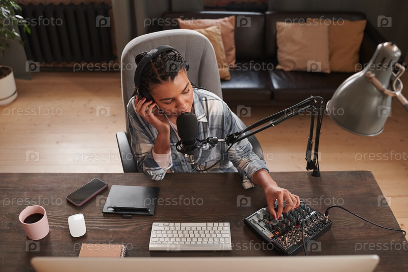 Высокоугольный портрет молодой женщины, сидящей за деревянным столом в домашней студии на чердаке, корректирующей настройки микрофона с помощью миксинговой консоли для начала трансляции