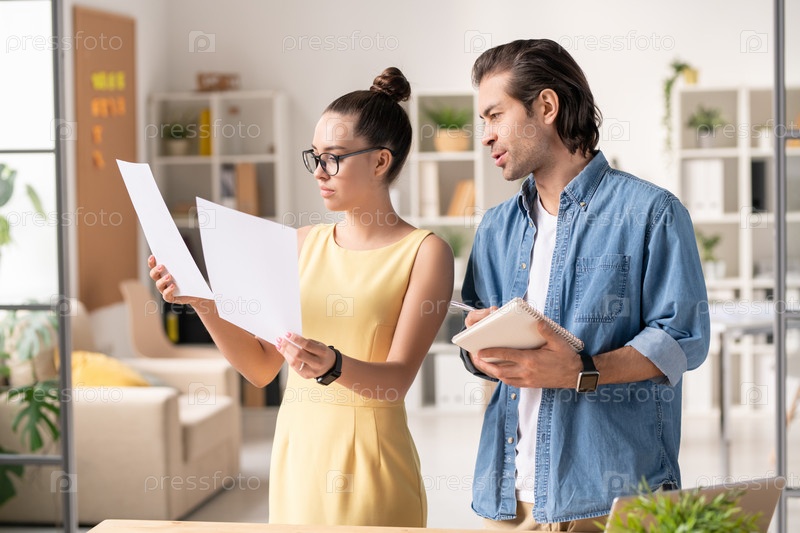 Молодая офисная работница сравнивает две работы во время консультации с коллегой