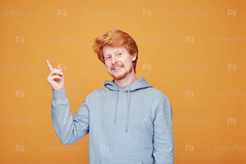 Счастливый молодой человек в синей толстовке с капюшоном, указывающий вверх, показывая вам что-то