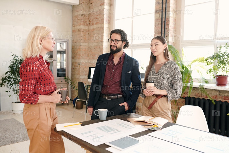 Счастливые молодые межкультурные коллеги в формальной одежде смотрят на зрелую женщину