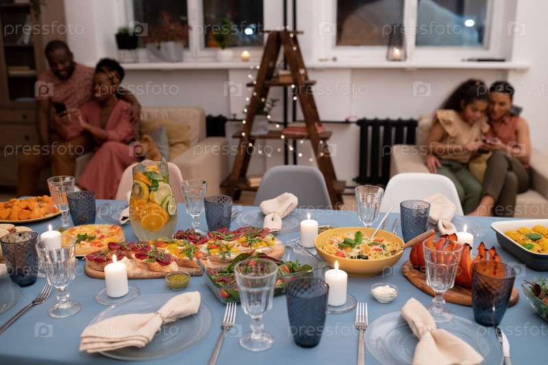 Сервируется праздничный стол с домашней едой, приготовленной для рождественского семейного ужина