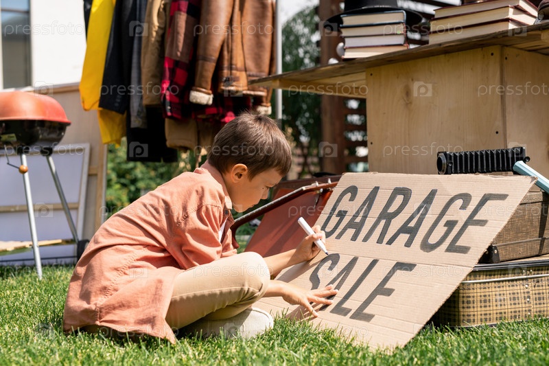 Мальчик пишет на картонном баннере