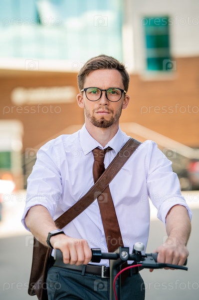 Молодой серьезный бизнесмен в очках и формальной одежде едет домой на велосипеде