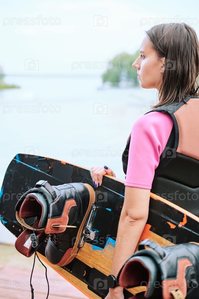 Молодая женщина-серфер с доской для серфинга стоит на берегу воды перед камерой