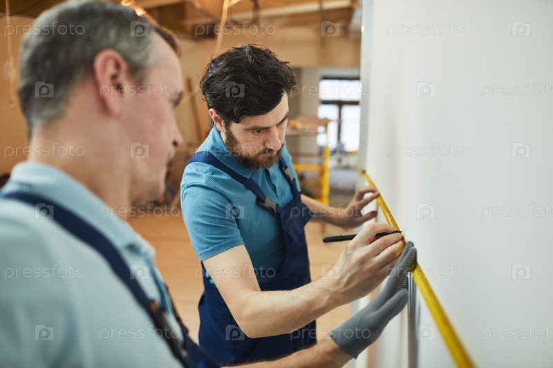 Рабочие, измеряющие стены