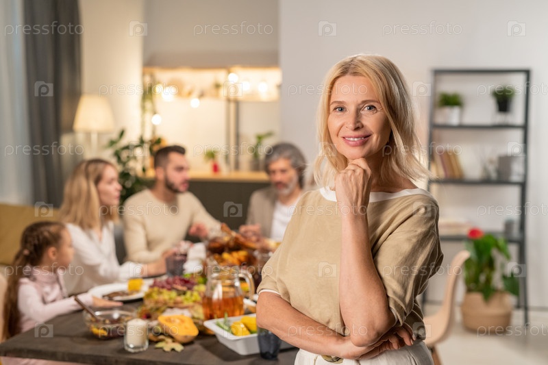 Счастливая зрелая женщина, стоящая перед камерой против большой семейной трапезы