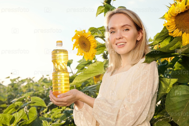 Улыбающаяся блондинка в белом платье держит бутылку подсолнечного масла