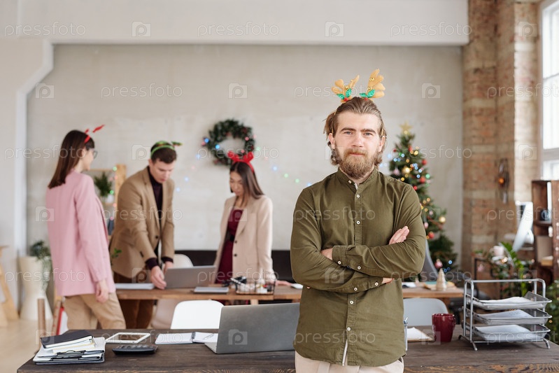 Молодой веселый бизнесмен в рубашке и рождественском головном уборе, скрестив руки на груди