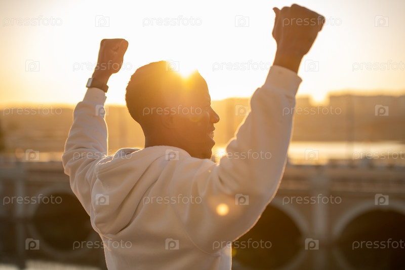 Счастливый молодой успешный спортсмен делает удары, держа руки поднятыми