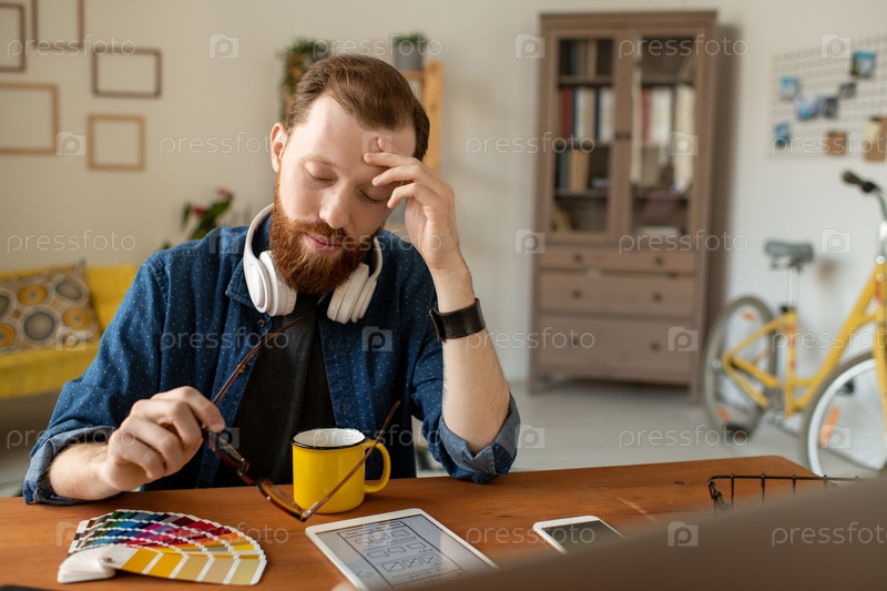 Молодой усталый мужской дизайнер-фрилансер, касающийся лба в то время как он наклоняется над кружкой