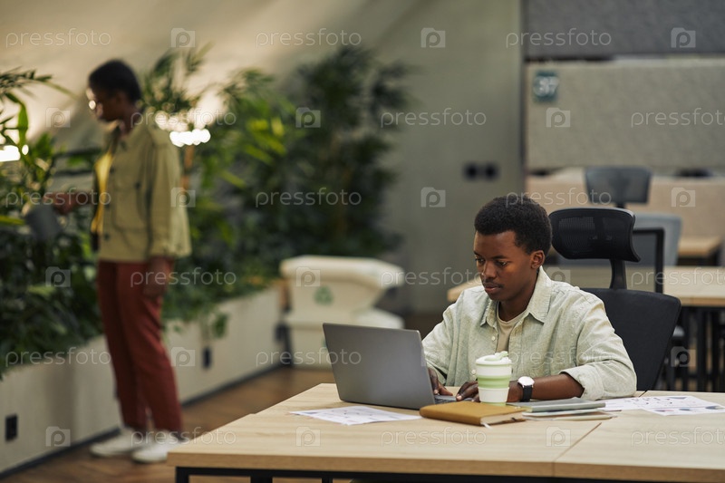 Молодой афроамериканец работает в офисе открытого пространства