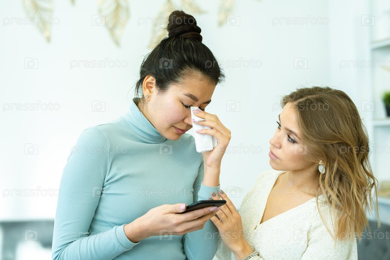 Красивая девушка утешает своего расстроенного друга, плачущего после получения плохого сообщения